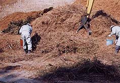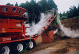 | 破砕時、摩擦熱によって100度の高温に上がるため、雑菌や雑草の発芽の心配はありません。また、破砕機の強力な磁力により釘金物は全て完全に除去されます。 ※高温破砕のため、植物のシブにより、緑色から茶色に変色します。 |