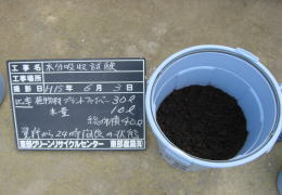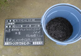 攪拌し、24時間後の状態 水分 85%吸収 ※プラントファイバーの量が少なく、水が滴り落ちる程。 体積 20リットル |